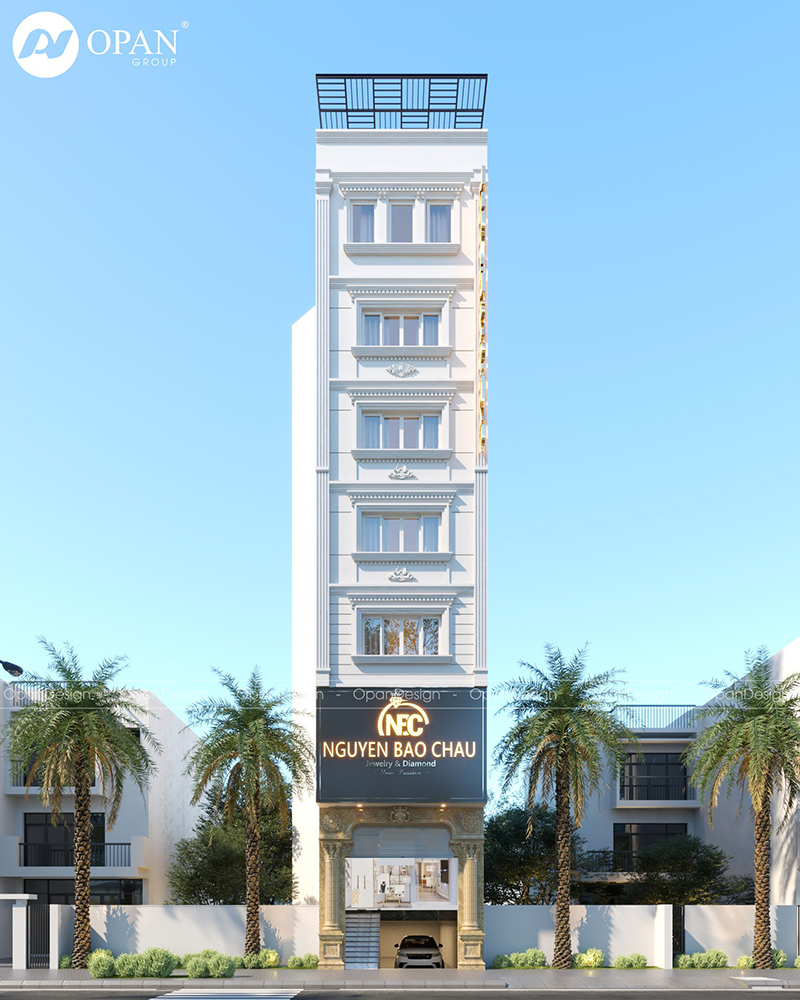 Công trình nổi bật từ xa bởi phong cách Tân cổ điển đồ sộ. Tone màu trắng chủ đạo góp phần giúp cho các chi tiết hoa văn, phào chỉ trở nên nổi bật, rõ nét hơn. Kết hợp cùng đèn trang trí tại mặt tiền, mang đến vẻ đẹp hài hòa cho tổng thể công trình.